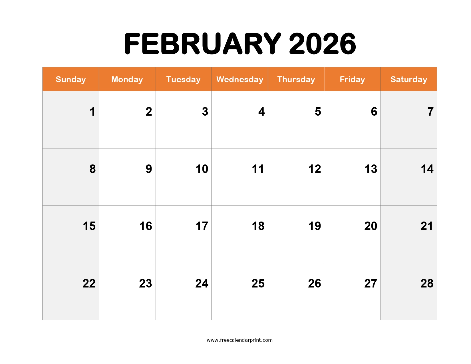 Printable February 2026 Calendar
