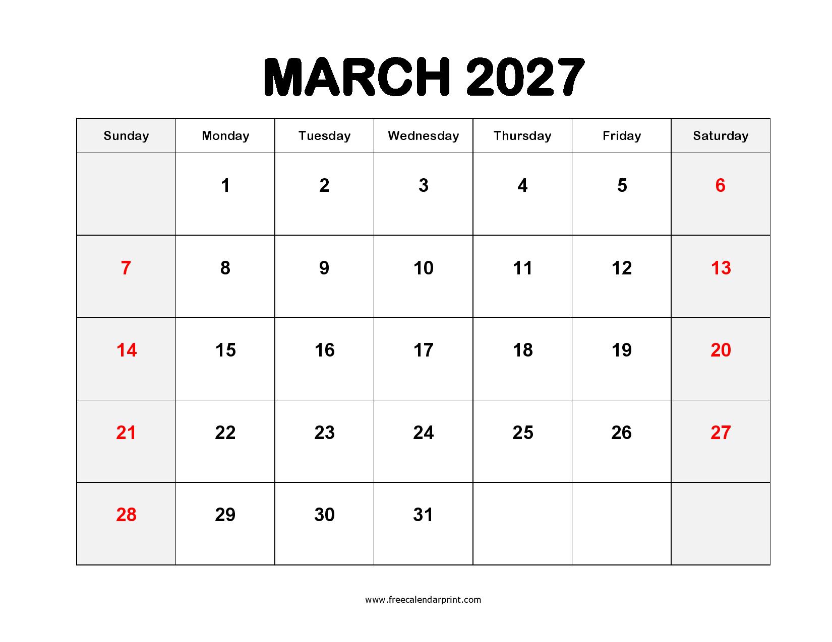 Printable March 2027 Calendar